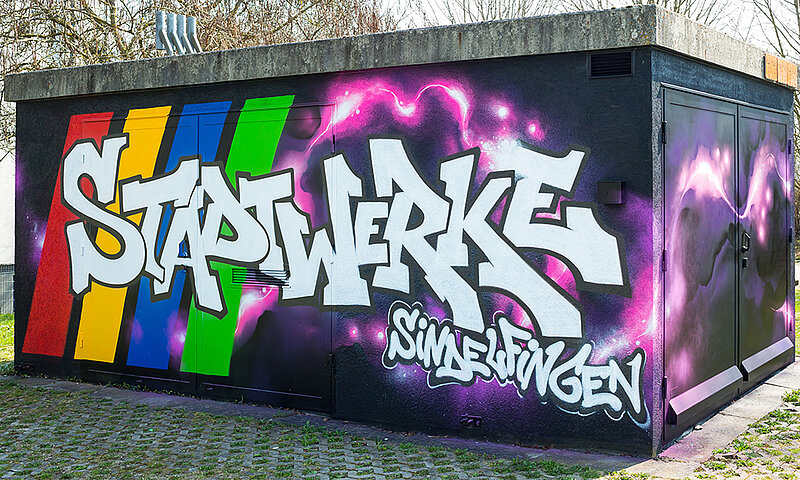 Seit dem Jahr 2017 versuchen wir mit hochwertiger Streetart-Kunst, das Erscheinungsbild unserer technischen Gebäude nachhaltig zu verbessern. Damit setzen wir auf den Ehrenkodex unter den richtigen Sprayern, dass Kunstwerke anderer Respekt genießen und nicht übermalt oder verschandelt werden. Besprüht werden die Gebäude vom Sindelfinger Künstler Maximilian Frank, der in den Szenekreisen unter dem Namen RAST bekannt ist.