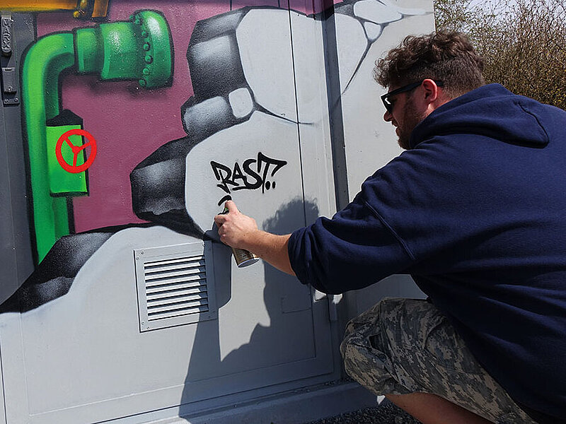 Erste positive Erfahrungen sammelten wir mit der Gasdruckregelstation in der Rudolf-Harbig-Straße (nahe Glaspalast). Diese wurde Anfang des Jahres 2018 durch ein Wandgemälde verschönert und blieb seitdem vor Schmierereien verschont. Damit das Graffiti auch in der dunklen Jahreszeit ins Auge fällt, wird es über ein LED-Band beleuchtet. Die Umgestaltung der Gasdruckregelstation war das erste von zahlreichen Projekten innerhalb der Region – weshalb wir auf dieses Projekt besonders stolz sind.